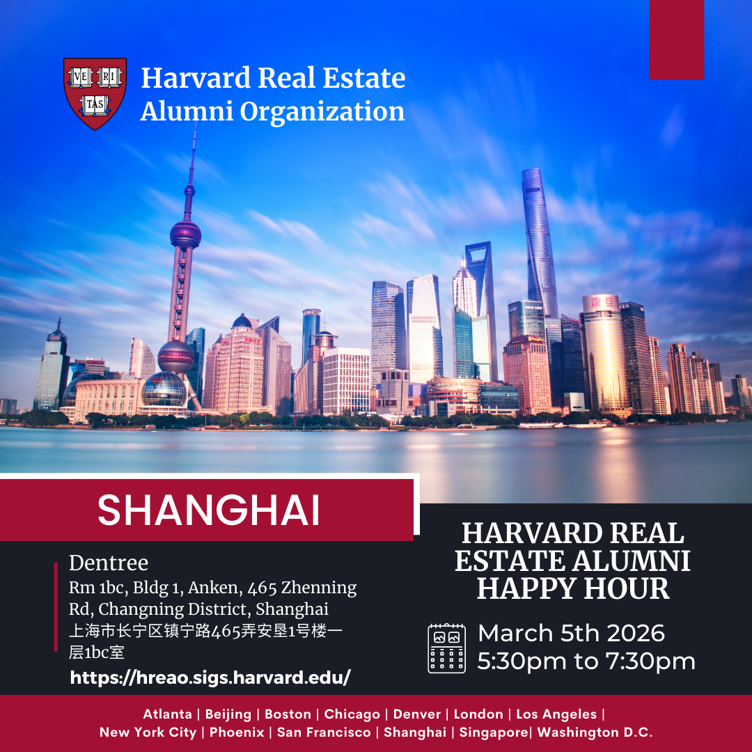 We cordially invite you to join us for our First Thursday of the Quarter Happy Hour event with the Shanghai China HREAO Chapter. As a valued member of the Harvard Real Estate Alumni Organization, we are organizing global events in participating cities on the first Thursday of each Quarter, providing you with the opportunity to connect with fellow Harvard Real Estate Alumni even if you are in a different city during the scheduled event time and location.