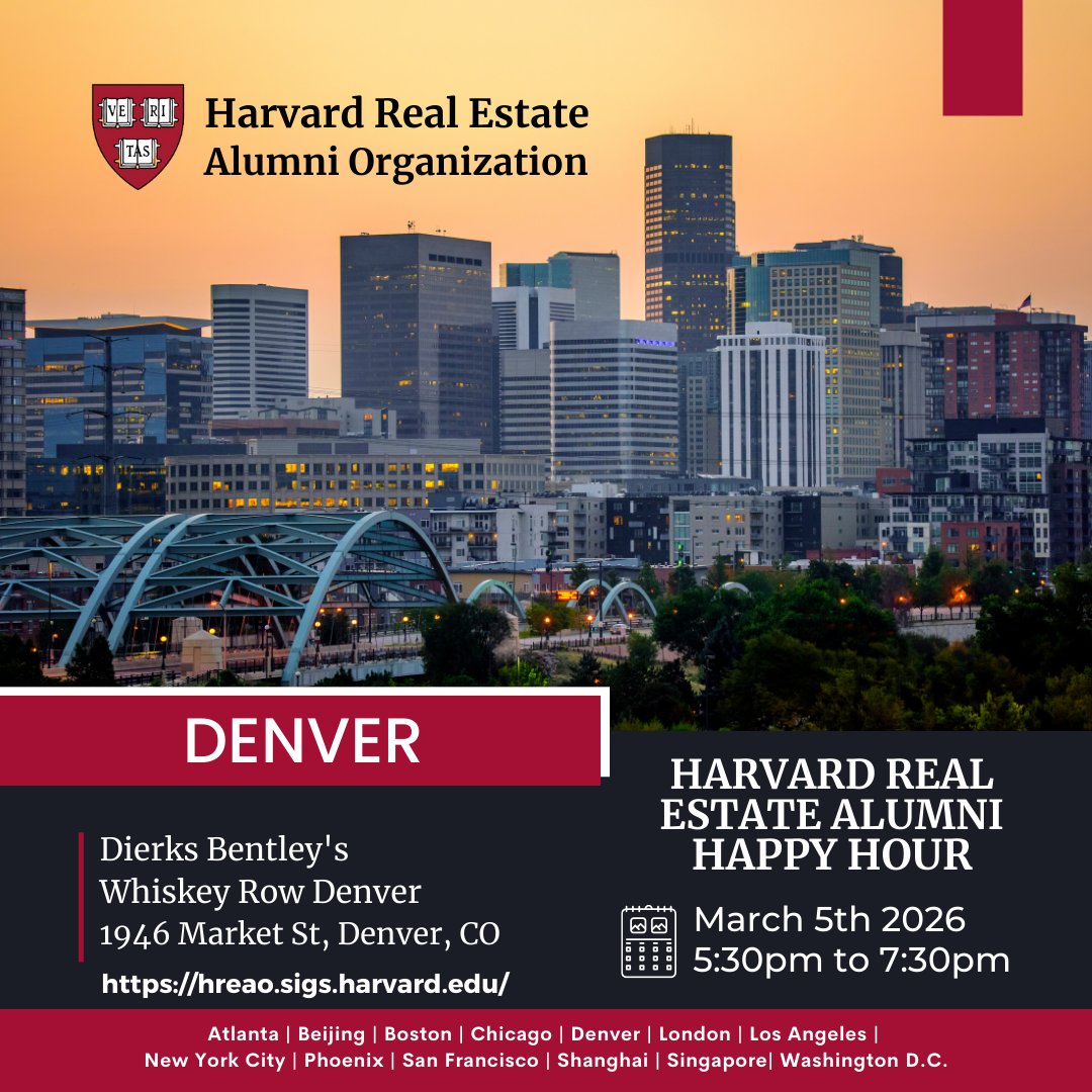 We cordially invite you to join us for our First Thursday of the Quarter Happy Hour event with the Denver HREAO Chapter. As a valued member of the Harvard Real Estate Alumni Organization, we are organizing global events in participating cities on the first Thursday of each Quarter, providing you with the opportunity to connect with fellow Harvard Real Estate Alumni even if you are in a different city during the scheduled event time and location.