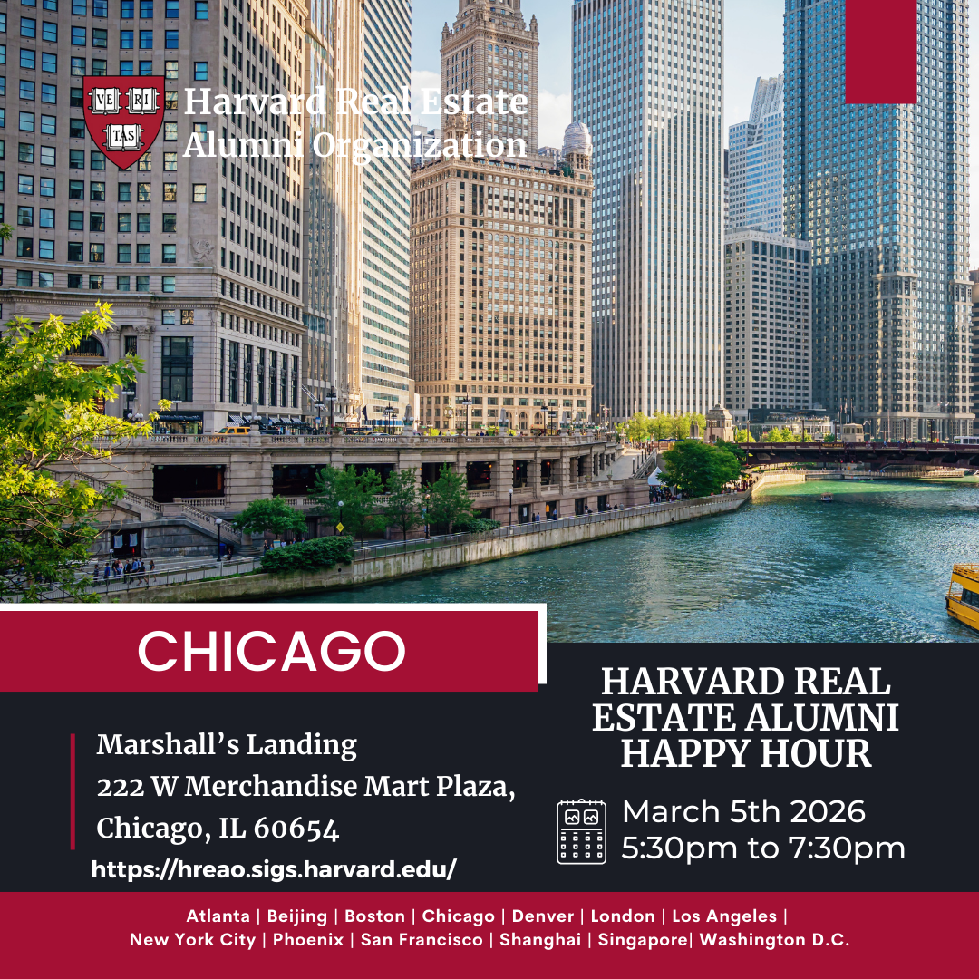 We cordially invite you to join us for our First Thursday of the Quarter Happy Hour event with the Chicago IL HREAO Chapter. As a valued member of the Harvard Real Estate Alumni Association, we organize global events in participating cities on the first Thursday of each Quarter, providing you with the opportunity to connect with fellow Harvard Real Estate Alumni even if you are in a different city during the scheduled event time and location.